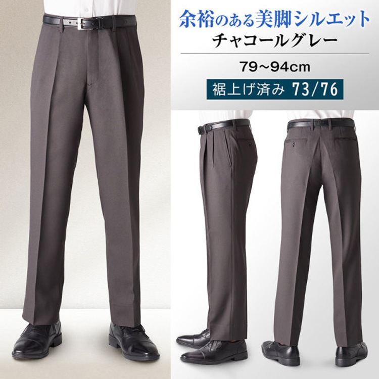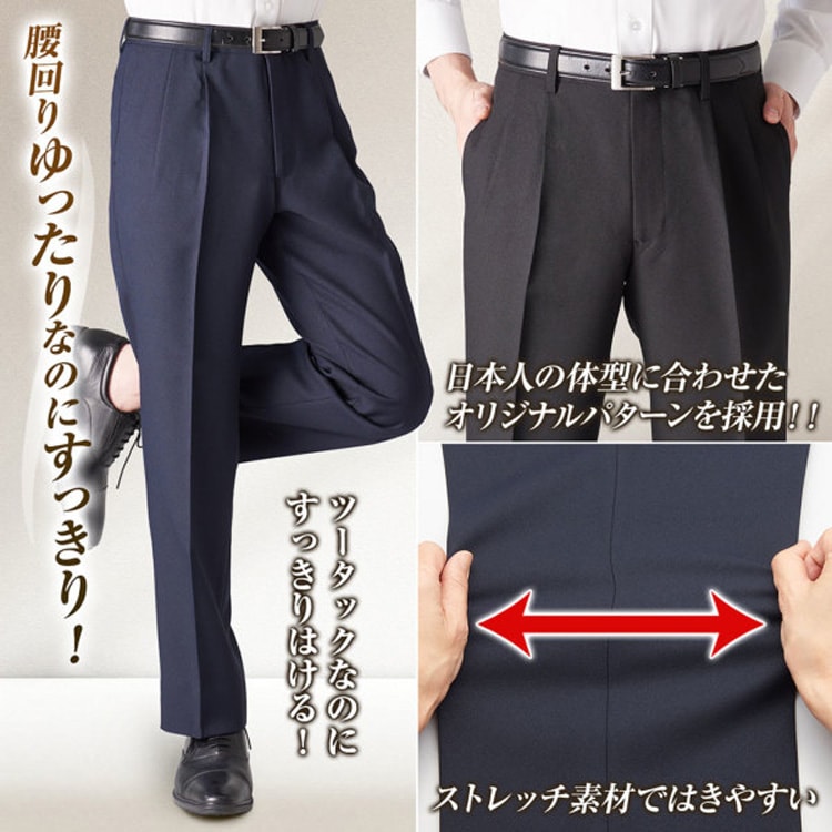 ビジネスシーンに大活躍の無地ツータックスラックス。腰周りにほどよいゆとりを持たせツータック仕様ながら、スッキリしたシルエットが特徴です。オールシーズン対応で、オン・オフ両方に着用出来る万能スラックスです。使い勝手の良い無地で、ブラック、チャコール、ネイビーのベーシックな3色展開。全身コーデに取り入れやすく、お持ちのジャケット・アウター・シャツなどにも組み合わせしやすいのも嬉しいポイント。 ご家庭の洗濯機で洗えるウォッシャブル仕様でお手入れも簡単です。※ゆったりタイプのため、多少大きく感じられることがありますのでご注意ください。※生地や加工の特性上、表記サイズと実寸は若干の誤差が生じることがございます。