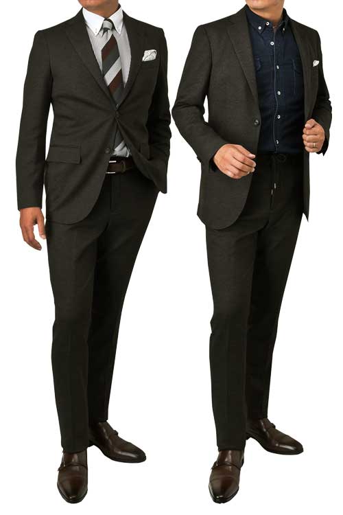タイドアップでもカジュアルダウンでも楽しめる2WAYスーツです。