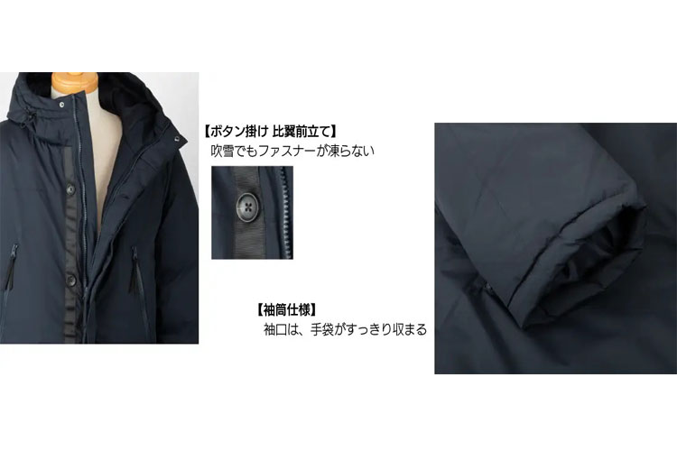 ボタン掛け比翼前掛けで寒い北海道の冬でもファスナーが凍る